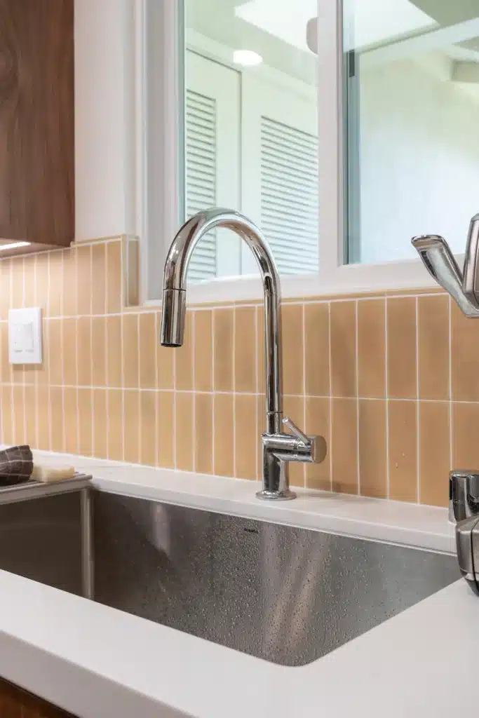 Replaced old tile with wide-plank white oak hardwood for a consistent, warm tone throughout the kitchen and living areas. - Tile + Backsplash: