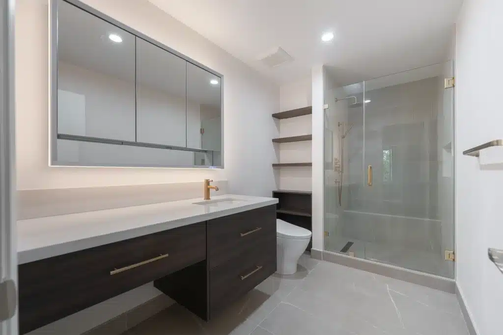- Floating Vanity with LED Mirror: Installed a double-drawer, wall-mounted vanity with warm walnut tones and gold hardware. Above it, a sleek LED mirror cabinet provides both storage and lighting.