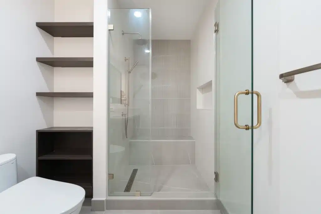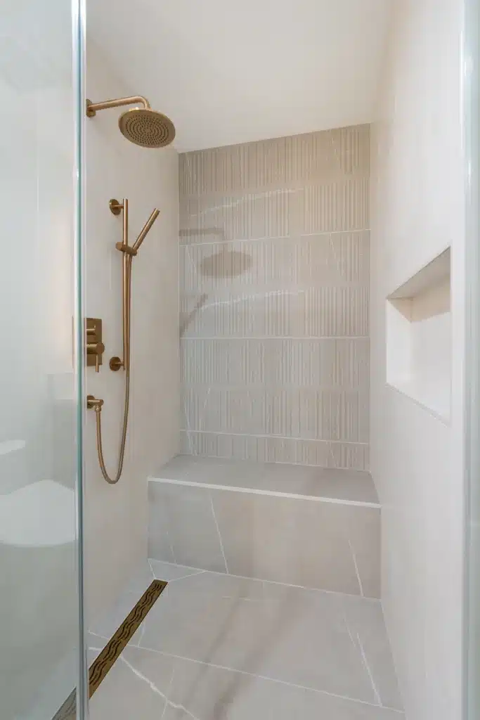 - Walk-In Shower with Bench: Added a walk-in shower with glass enclosure, integrated bench, built-in niche, and linear floor drain. The back wall tile design adds visual depth.