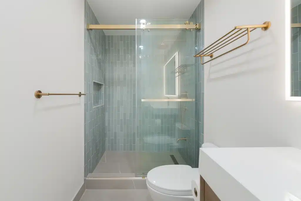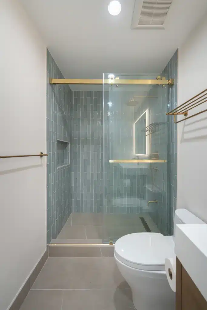 - Sliding Glass Shower Door: Added a sleek gold-accented sliding door to conserve space while showcasing the tiled wall.