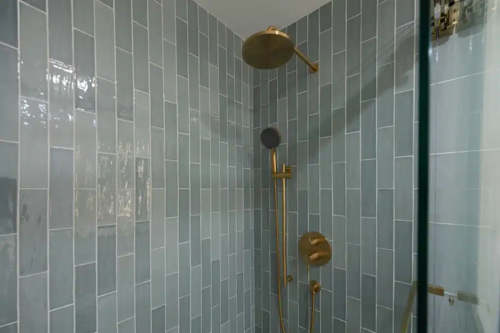 - Vertical Green Tile Statement Wall: Custom-set vertical zellige-style green tiles to add personality.