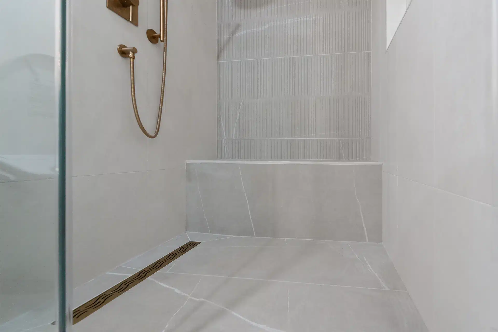 - Walk-In Shower with Bench: Added a walk-in shower with glass enclosure, integrated bench, built-in niche, and linear floor drain. The back wall tile design adds visual depth.
