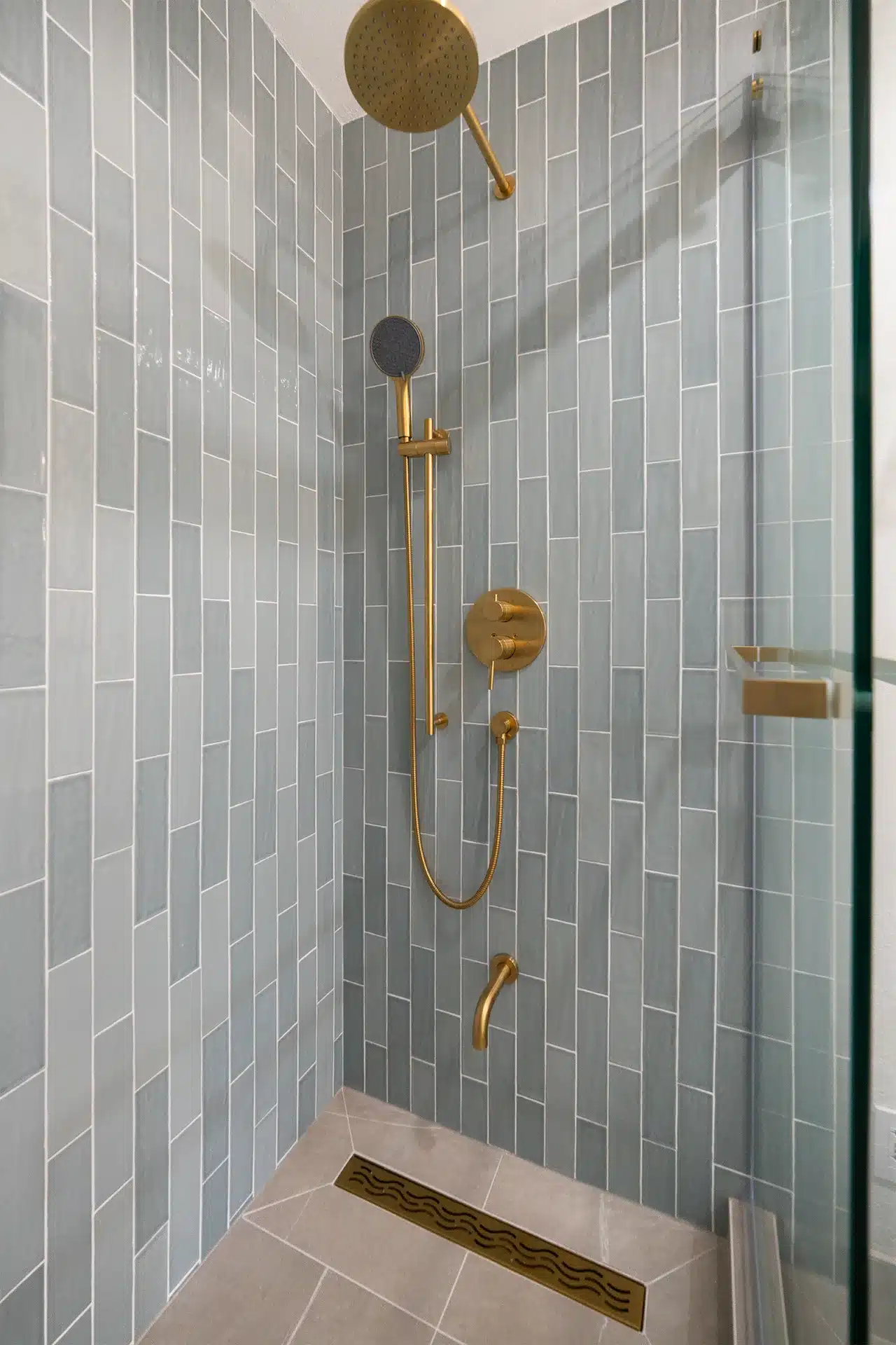 - Sliding Glass Shower Door: Added a sleek gold-accented sliding door to conserve space while showcasing the tiled wall.